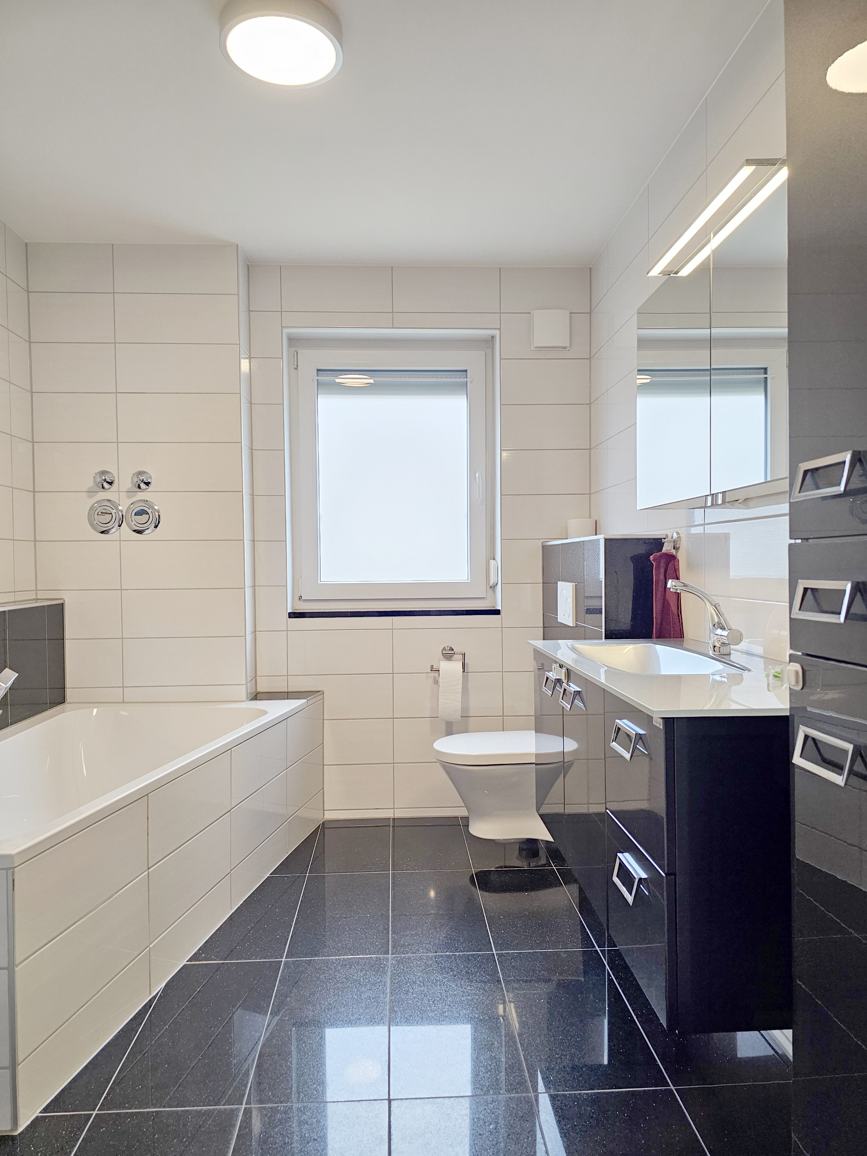 Das Tageslichtbad mit Dusche und Wanne bietet viel Platz und Komfort. Eine Waschmaschine kann sowohl hier als auch im gemeinschaftlichen Waschkeller angeschlossen werden – ganz nach Bedarf.